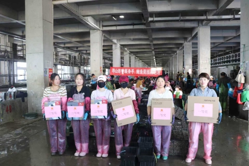 活动现场,参赛工人快速地将不相同的标准巨细的鲍鱼进行称重、分拣,装入相应标准的箱笼内,她们的双手在鲍鱼之间灵敏络绎,分拣精准,终究6名优胜能手分获一、二、三等奖。